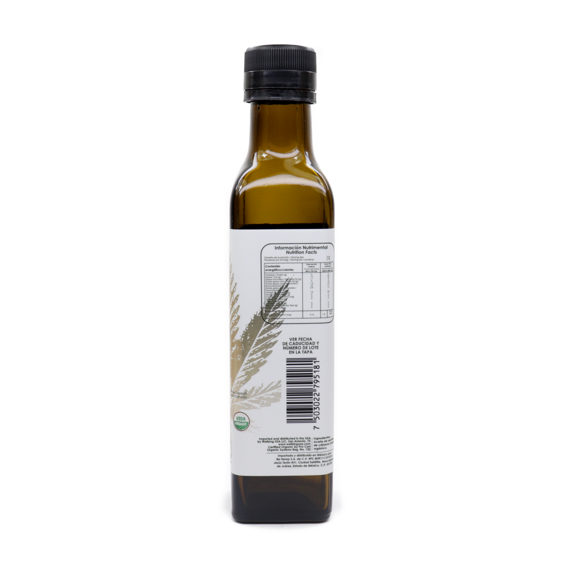 El aceite de hemp (hemp oil) es un producto natural que se extrae mecánicamente sin el uso de productos químicos, conservantes ni aditivos. Es prensado en frío a temperaturas por debajo de 50º C y recién exprimido se clarifica a través de un filtrado en frío. Ésta tecnología elimina naturalmente los sólidos suspendidos. Se envasa en una atmósfera libre de oxígeno para asegurar un producto fresco y de calidad. Reconocido por la OMS (Organización Mundial de la Salud) por tener el balance ideal de 3 a 1 de Omega 6 a Omega 3. No debe utilizarse para cocinar o freír.